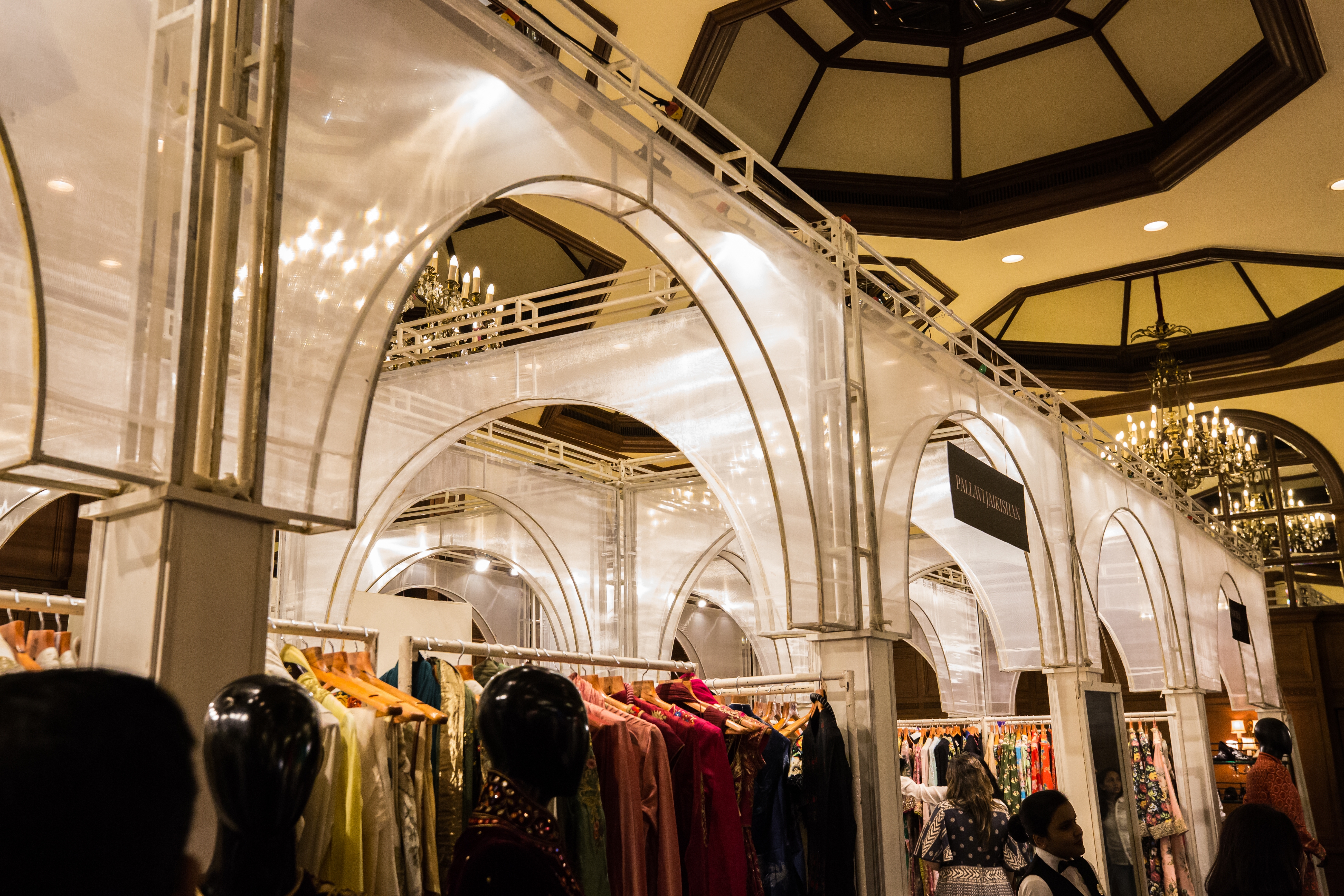 The banquets at Taj Bengal, Kolkata were approached with a practical outlook, ensuring that the designs didn’t interfere with the main aim of the exhibit — retail. The elements and styles were strong juxtapositions: Arches + industrial; sheer fabric + metal sheets and acrylic.