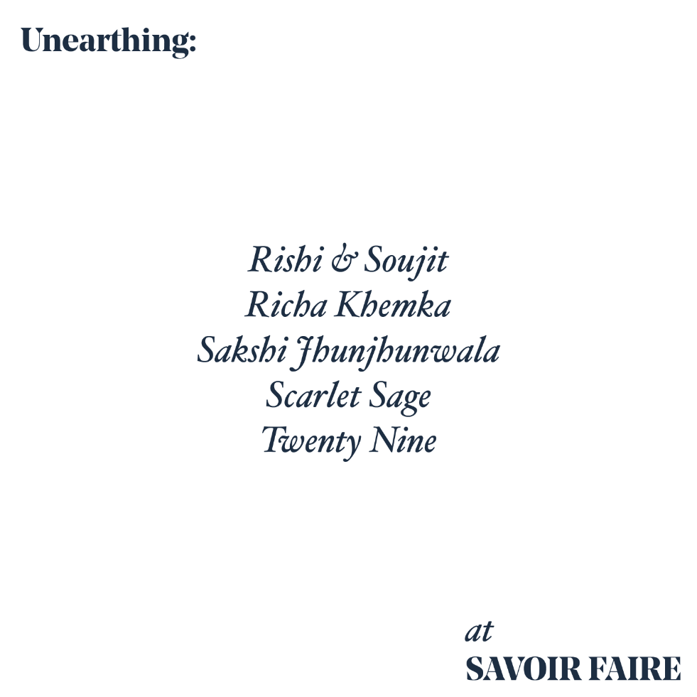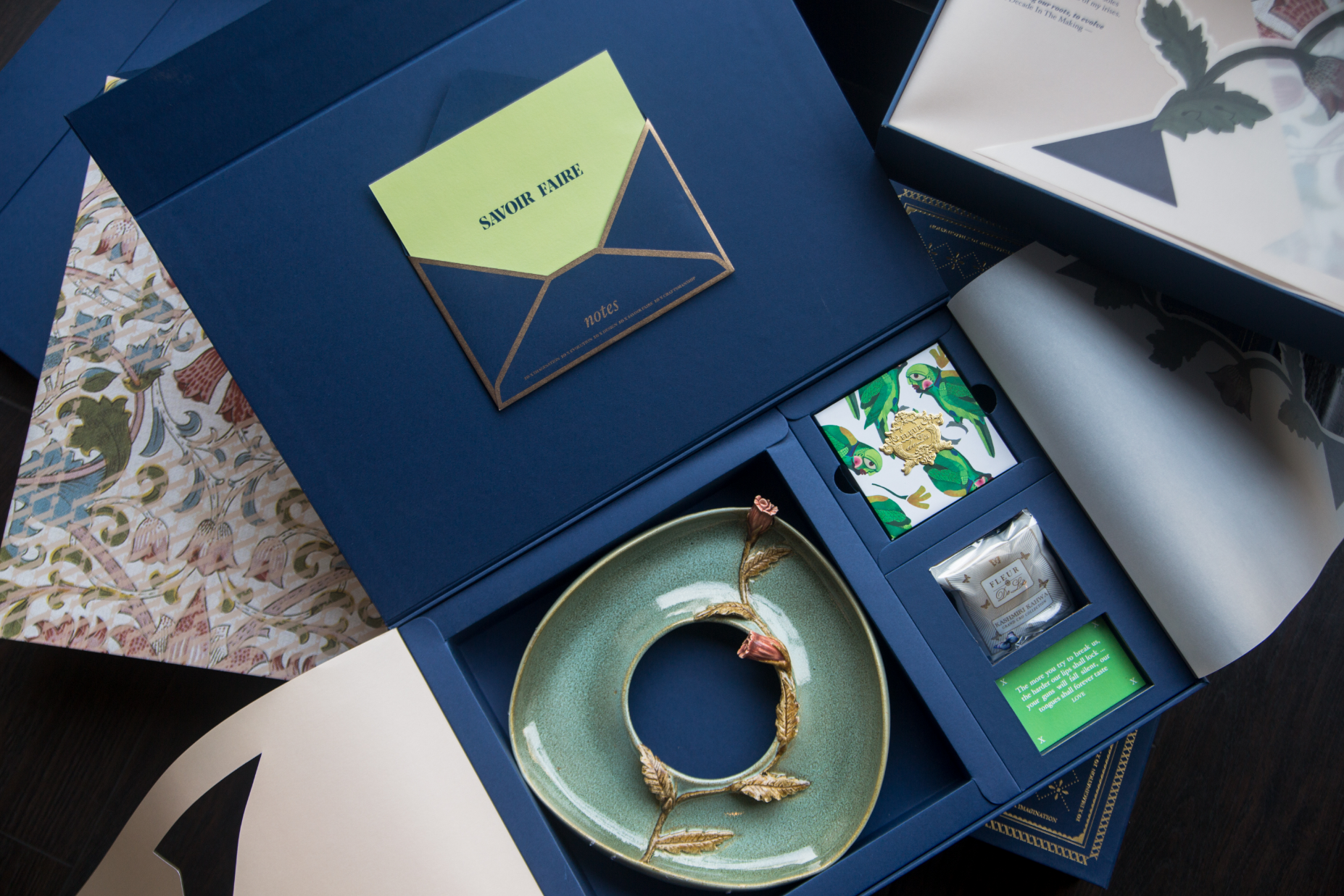 Gift boxes inspired by antique jewellery cases carried forward this extension long with the idea of unearthing layers to reveal Fluer De Lis edibles; a custom Anupaamaa G Jalan x BOBO Calcutta ceramic platter and a vintage embossed note card.